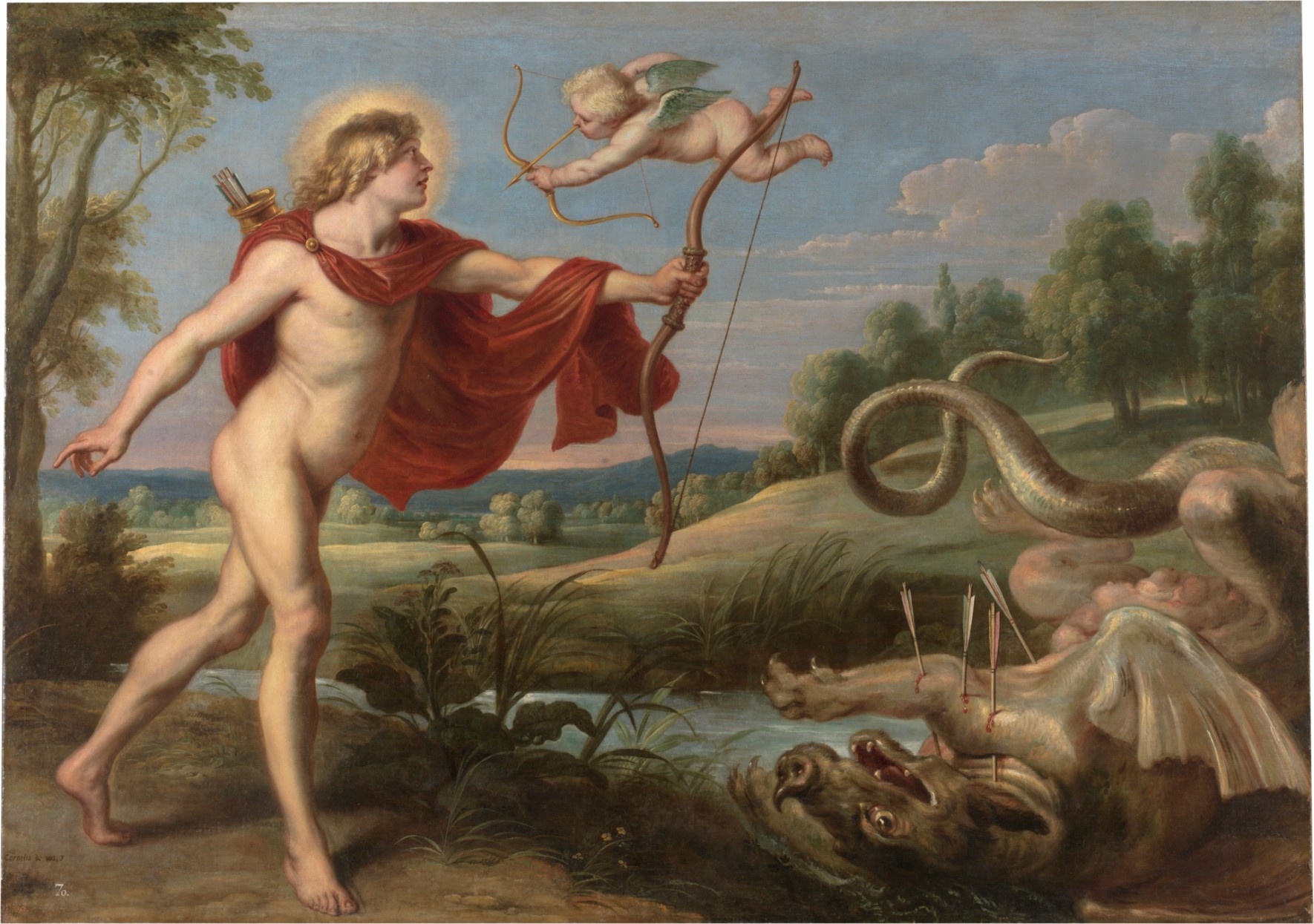 Apolo es el dios sol, de la medicina, la música y la belleza masculina. Siendo un niño liberó la región de Delfos de la serpiente Pitón, matándola con su arco; instauró allí su oráculo en el que, a través de una sacerdotisa Pitia auguraba el futuro de los mortales. Tras burlarse de Eros, el pequeño dios le demostró lo poderoso que es el amor haciendo que se enamorase de Dafne con una flecha de oro, y disparando a la ninfa con una de plomo para hacer que odiase a Apolo. Tras ser perseguida durante horas por el dios Sol, Dafne le pidió a los dioses que la ayudasen, y estos la transformaron en un laurel. Para recordarla siempre Apolo se hizo una corona con las hojas de este árbol.